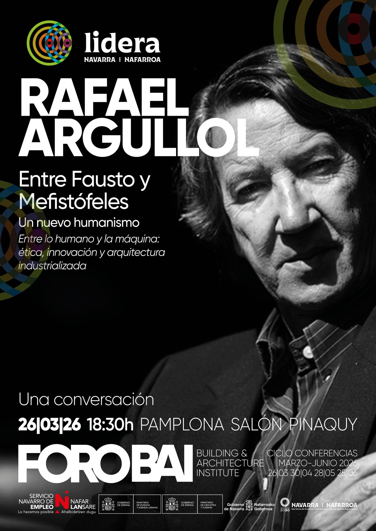 FORO BAI 2026 opens with Rafael Argullol, one of the most prominent voices in contemporary Hispanic thought. Under the title “Between Faust and Mephistopheles: A New Humanism,” the session will take the form of a conversation with Eduardo Prieto and Francisco Mangado, offering a reflection on the tensions between knowledge, technique, culture, and responsibility in the contemporary world. From a humanistic and critical perspective, the discussion will raise questions about the role of thought in an era marked by technological acceleration and profound transformations in cultural frameworks. With this opening lecture, FORO BAI positions architectural debate in dialogue with the humanities and reinforces its commitment to fostering a broader public conversation. The lecture will take place on March 26, 2026, at 18:30 in the Salón Pinaquy, the former church of the Salesas Convent in Pamplona. Free admission until full capacity. Activity subsidized by Lidera and the Servicio Navarro de Empleo–Nafar Lansare.