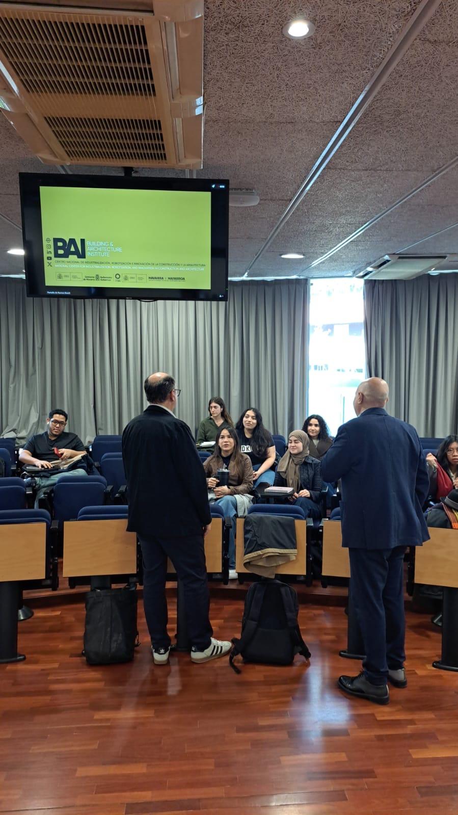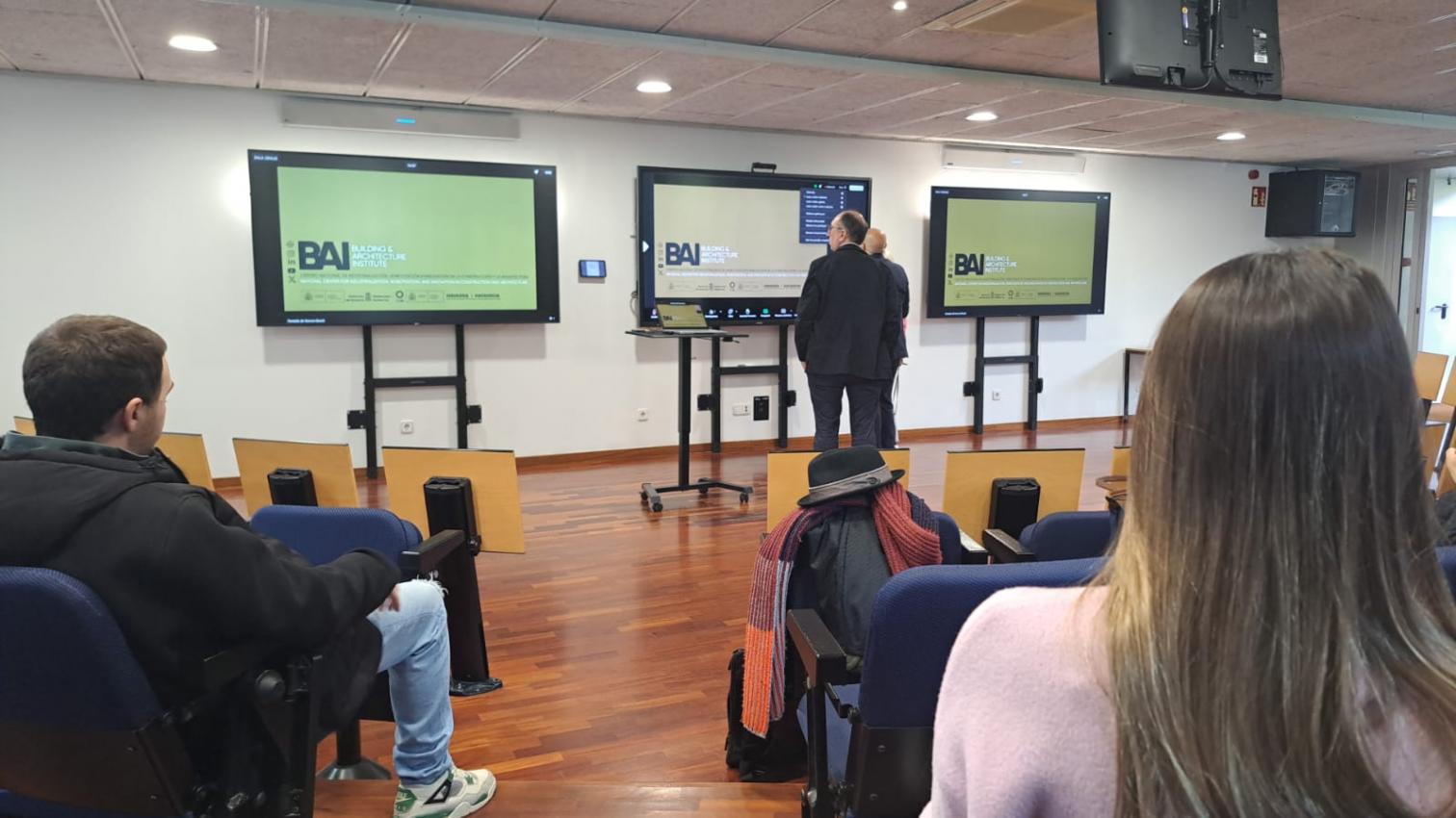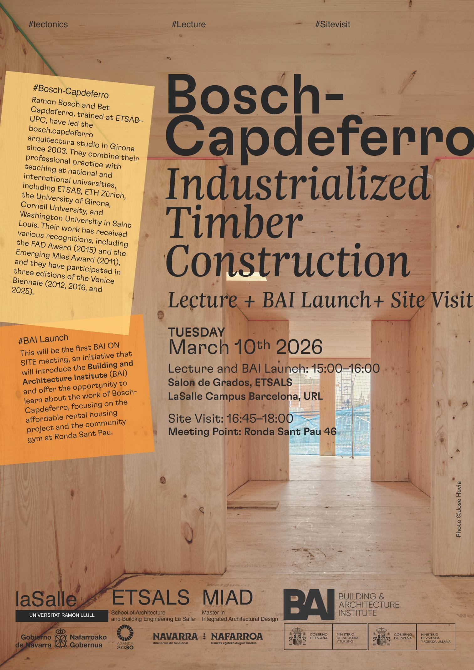 Ricardo Devesa (Director Master in Integrated Architectural Design, ETSALS, La Salle, Ramon Llull University) acogió y moderó esta propuesta desde una óptica certeramente crítica y abordando los fundamentos en los que se deben leer estas nuevas propuestas contemporáneas, al margen de inercias recurrentes. Fernando Moral expuso la realidad de BAI: una nueva institución que busca asociar, radicalmente, la teoría con la práctica arquitectónica junto con la industria y la innovación. Bosch.capdeferro y su bloque de viviendas asequibles y gimnasio social en Sant Pau (Barcelona) fueron el eje central de la jornada. Ramón Bosch reveló las claves del proyecto en pantalla, desde su génesis intelectual, hasta las cuestiones más determinantes a nivel constructivo, como antesala de la visita a la citada obra en fase final de desarrollo. El estudiantado que participó en BAI ON SITE pudo comprender cómo los elementos principales de la propuesta, en este caso de madera, se ensamblan de forma precisa al tiempo que dialogan con otros entes clave como son, en esta parcela, el trazado de Metro y las preexistencias residenciales. El bloque de Sant Pau exhibe de forma nítida la realidad de una industrialización sostenible, ágil y cualitativamente diferencial. Desde su cimentación, hasta el complejo sistema de instalaciones de un inmueble multifuncional, pasando por el control acústico y de acabados, entre otros hitos, fue conocido por todos los participantes de forma nítida. El edificio no sólo transformará el barrio que lo acoge, también procesos reiteradamente trabajados en la materialización de estas edificaciones.