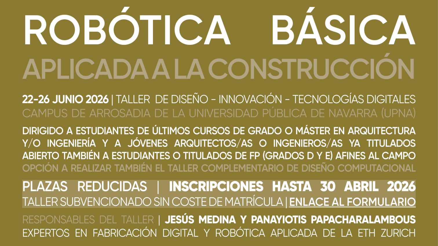En lo que toca a su relación con la arquitectura y la construcción, cualquier introducción debe atender a varias preguntas fundamentales: ¿Cómo puede transmitirse la información desde el sujeto que diseña hasta la máquina que construye? ¿Cuál es el lenguaje que permite la comunicación con las máquinas? ¿Cómo controlar adecuadamente ese lenguaje para que el robot realice la tarea de la manera más óptima posible? Para responder a estas preguntas, el taller iniciará a los alumnos en el lenguaje de la robótica con el objetivo de que las máquinas o robots puedan realizar tareas sencillas, como la colocación de elementos en la posición adecuada, la manipulación de piezas a través del corte total o parcial o la construcción de ensambles mediante soluciones diversas.
